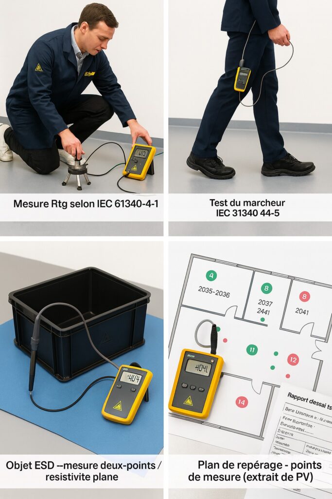 - Mesures de laboratoire et tests ESD : vérification de la résistance des sols, emballages, zones EPA et dispositifs ionisants.